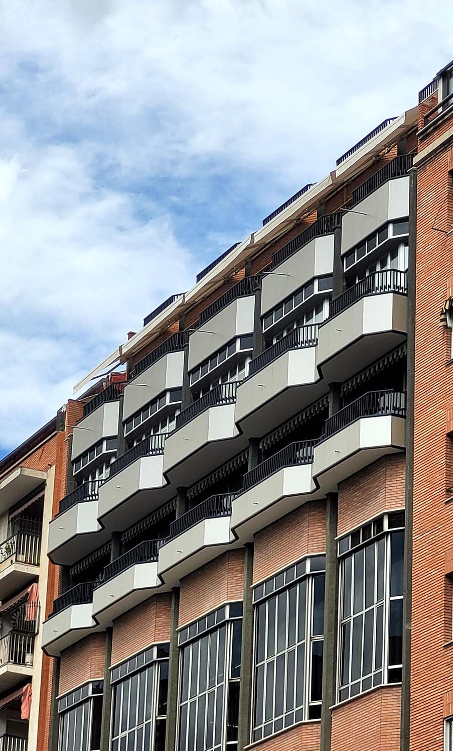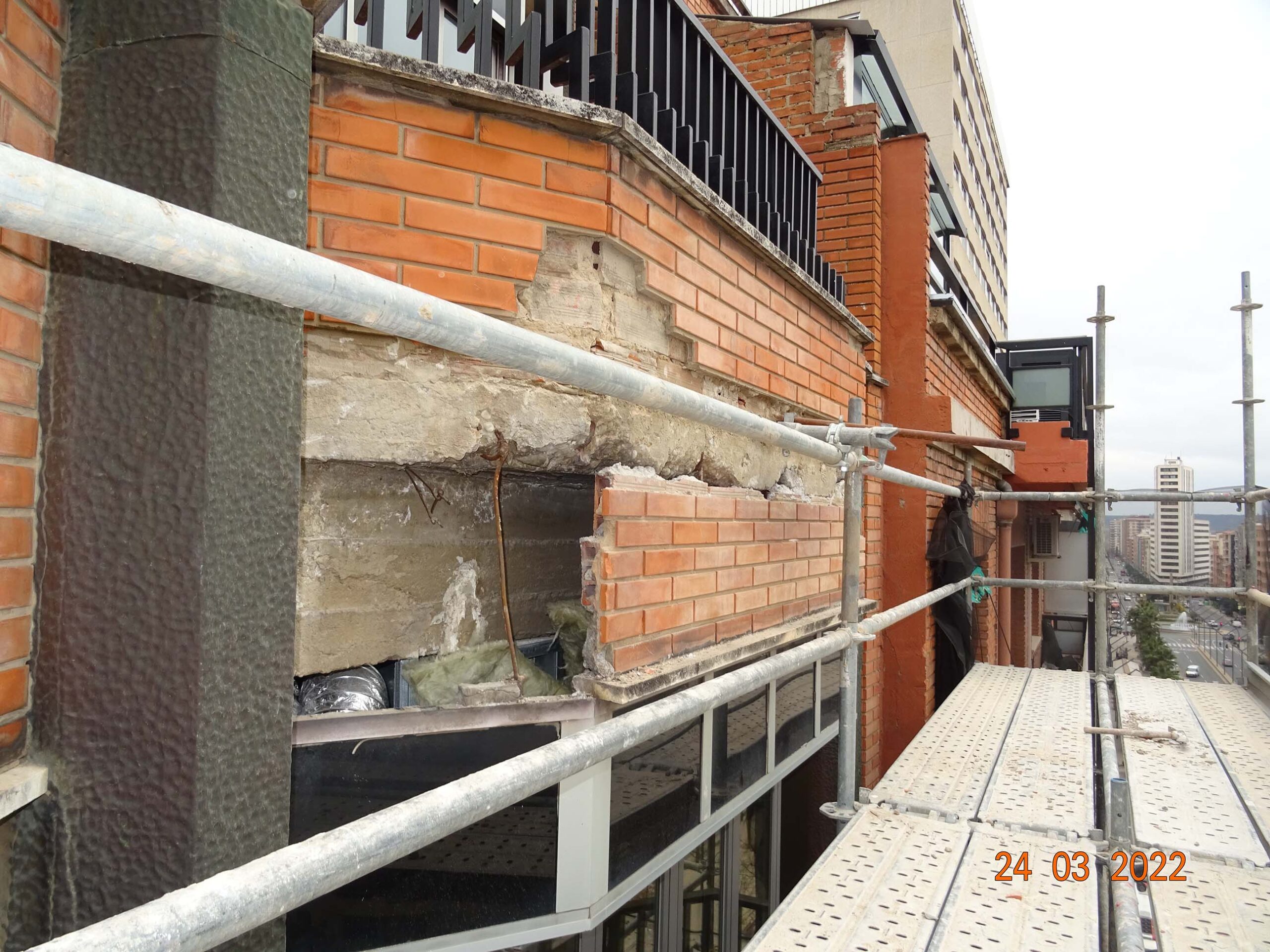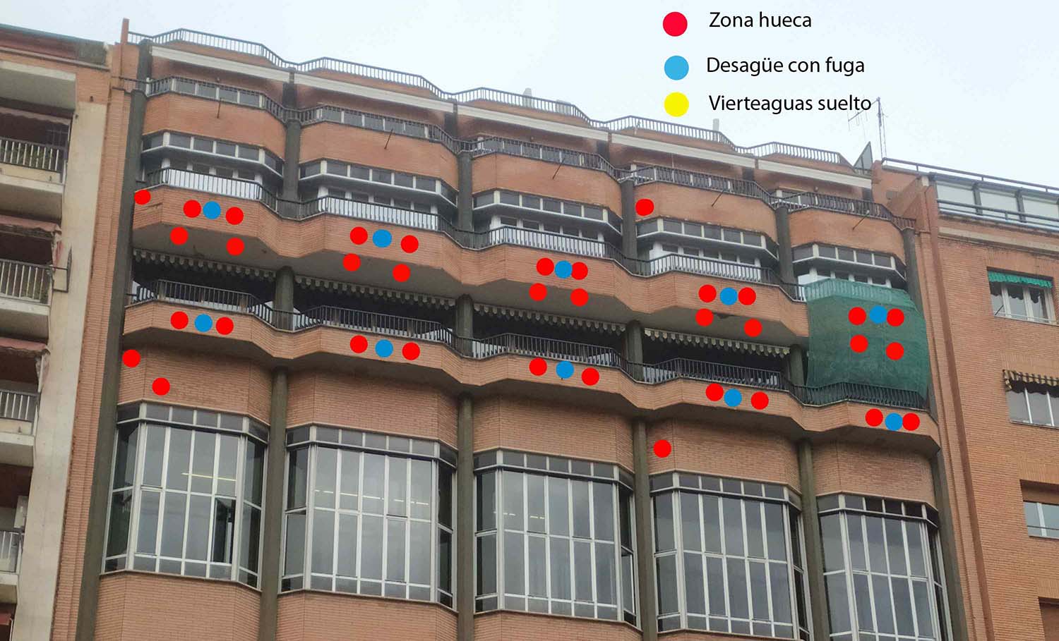 En la revisión de la fachada principal, realizada por operarios de trabajos verticales, se advierte que estaban completamente ahuecados los revestimientos de los balcones de planta 6ª, 7ª y 8ª del edificio, consistentes en paños enteros de plaqueta de ladrillo cara vista, recibidos con un mortero en mal estado y con riesgo de desprendimiento hacia la vía pública.