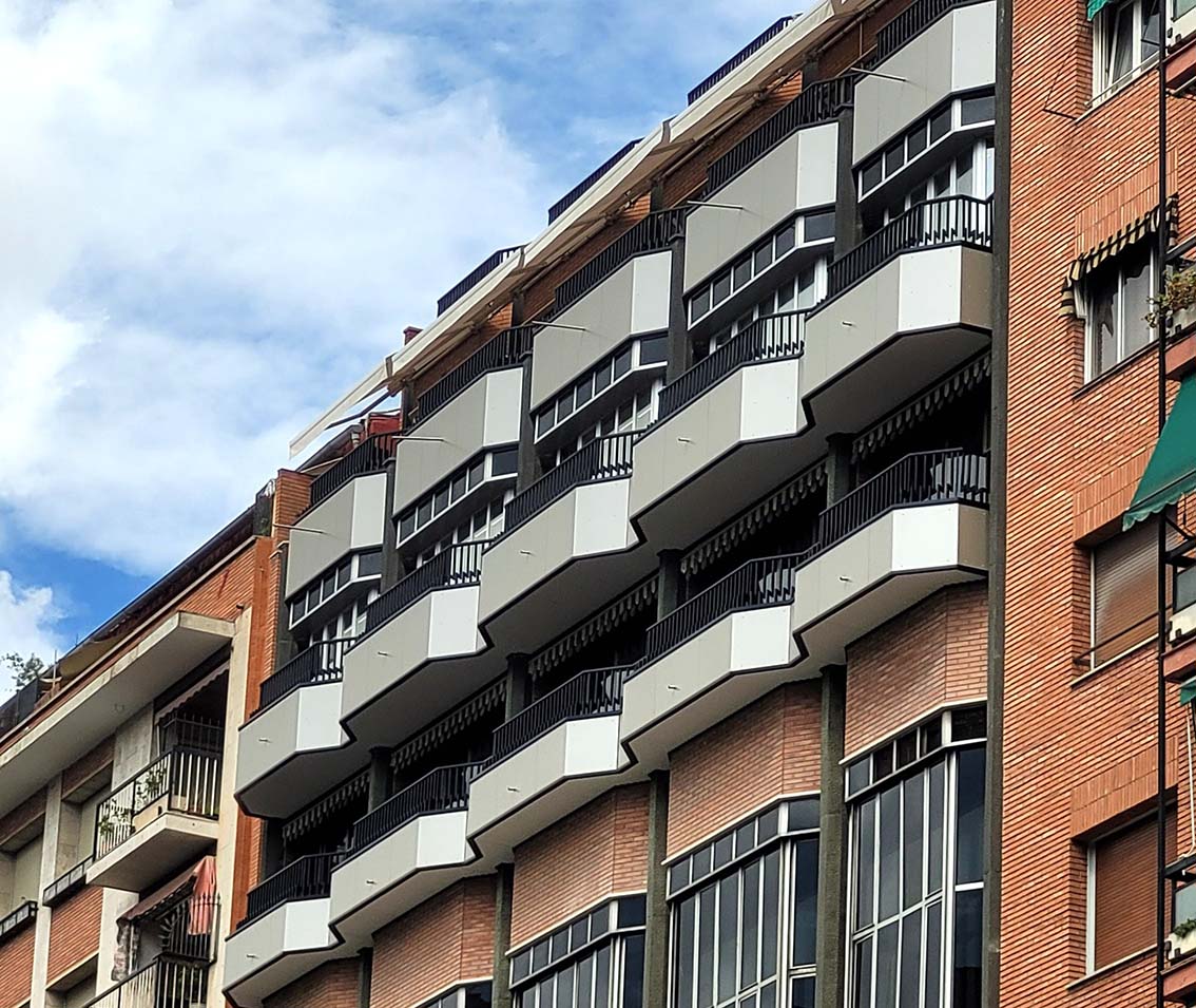 En consecuencia, se propone un nuevo revestimiento de dichas partes de la fachada mediante panel composite de aluminio FR, sobre una subestructura metálica anclada mecánicamente a las partes resistentes del edificio (frente de forjados y pretiles de los balcones)