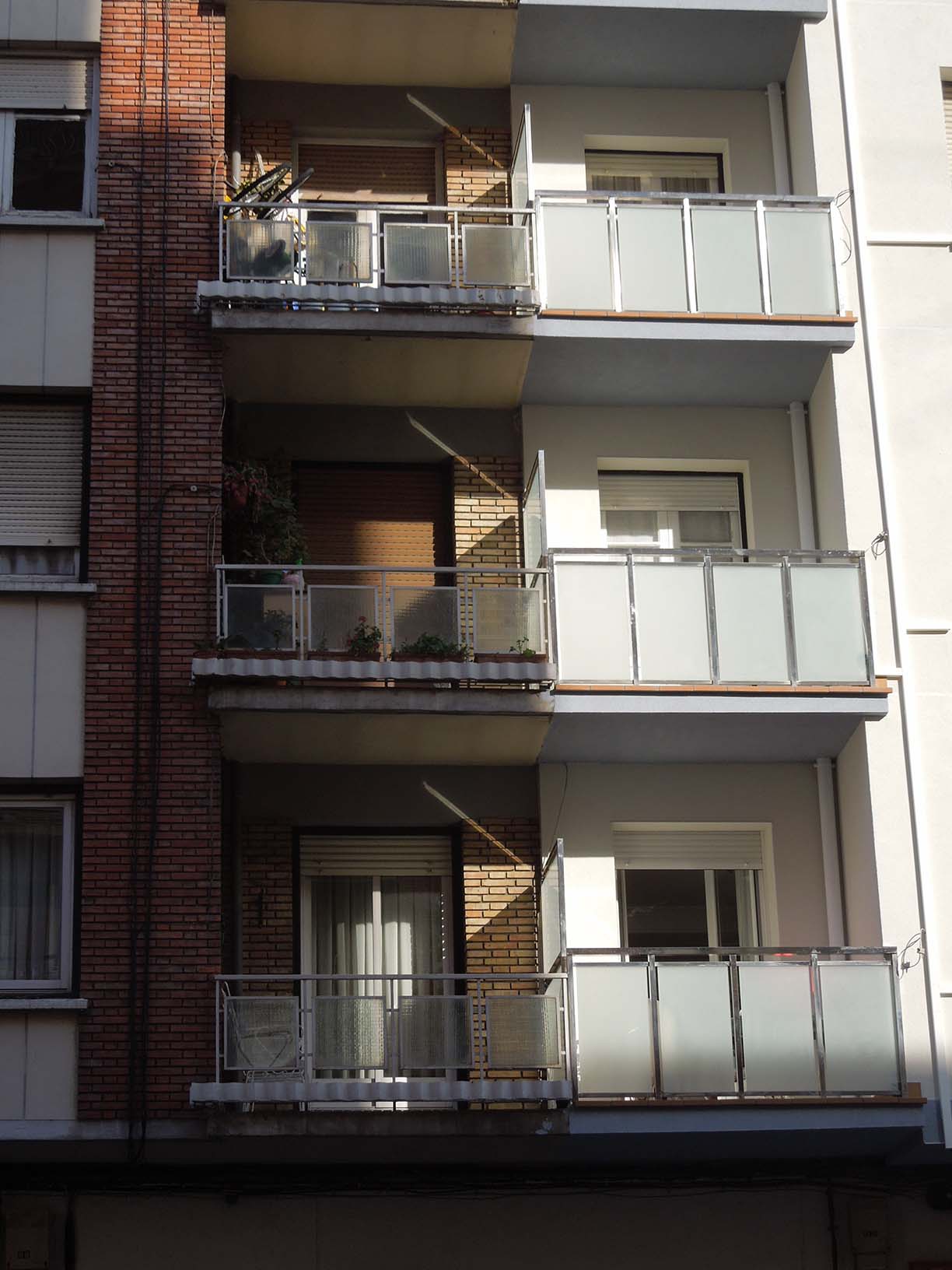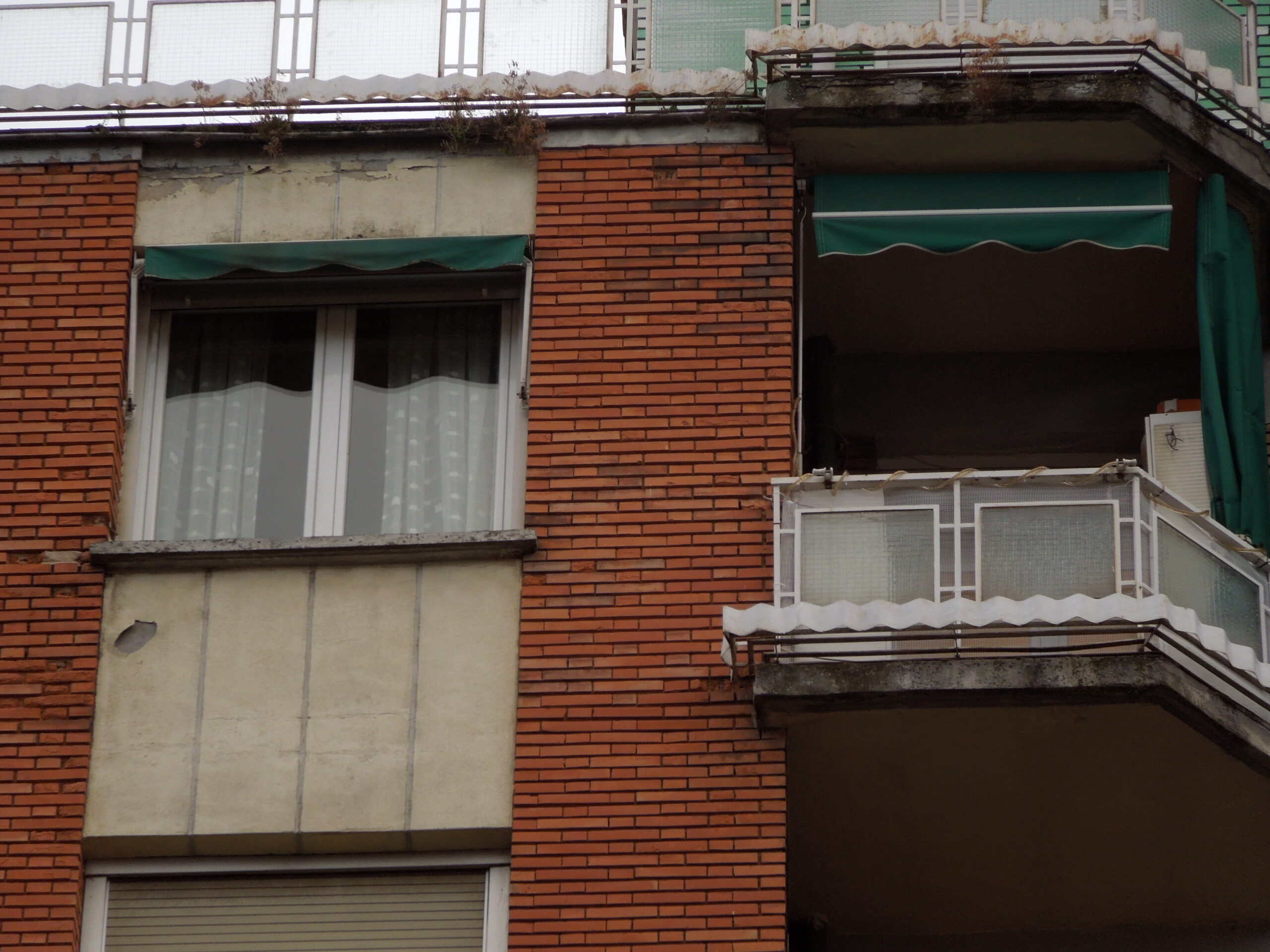Tras realizar una inspección en la fachada principal del inmueble, se constata que amplias áreas del ladrillo rojo cara vista se encuentran en mal estado. Esto se debe a una deficiente cocción del ladrillo en su fabricación, lo cual ha permitido que el agua procedente de los habituales fenómenos meteorológicos (lluvia, rocío, escarcha, etc.) cuele dentro de la estructura porosa interna de los ladrillos rojos, sobre todo en las partes de fachada más expuestas (plantas más altas). Esto provoca que cuando se producen heladas la estructura interior de algunas piezas del ladrillo rojo reviente parcial o totalmente.